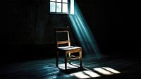 Stralen zonlicht die door een raam vallen verlichten een oude houten stoel in een donkere, lege kamer. De scène ademt een sfeer van eenzaamheid, melancholie en verlatenheid.