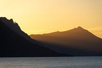 De laatste zonnestralen verdwijnen achter de bergen van Patagonië en raken het Huechulafquen meer in het Lanin National Park.