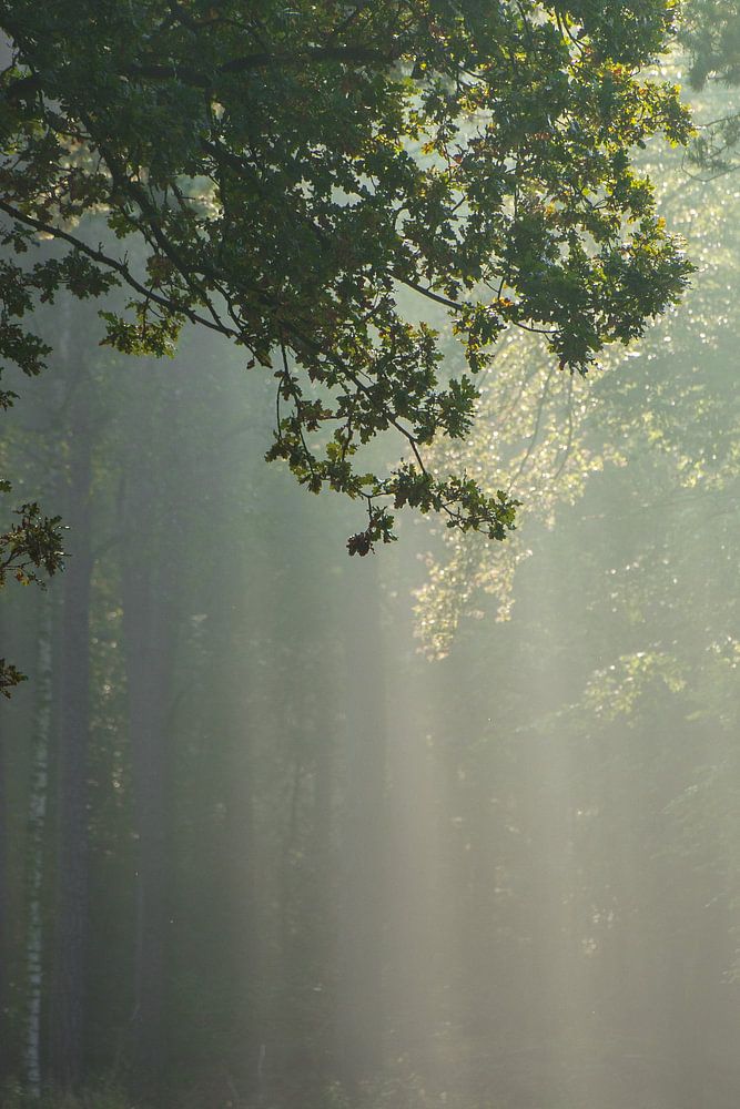 De zon breekt door het bladerdek en valt op het bospad van landgoed Heidestein nabij Zeist (Utrecht). Een magisch en mooi gezicht.