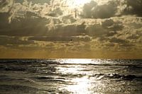 Vanaf de Noord-Hollandse kust over de Noordzee kijken. Gouden zonnestralen schijnen door de wolken op de zee. Hargen aan Zee, Noord-Holland, Nederland