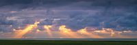 Een weids 3x1 panorama beeld van een avond bij Noordpolderzijl tijdens zonsondergang met uitzicht over de Waddenzee.