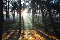 Zonnestralen schijnen door de mist in het bos. Mistige ochtend. Brunsummerheide in Limburg Nederland.