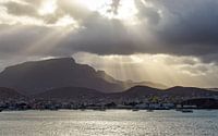 De ochtendzon schijnt stralen door he wolkendek boven Mindelo. Het zeewater wordt verlicht door de zon. De bergen zijn silhouetten op de achtergrond