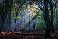 Zonnestralen vallen door de bomen van het Speulderbos waar de herfst zijn intrede doet. Het Speulderbos ligt in het noordwesten van de Veluwe in Gelderland