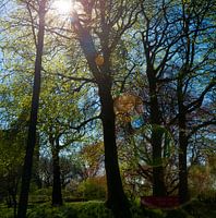 Zonnestralen schijnen door bladeren van de hoge bomen op een mooie herfstdag.