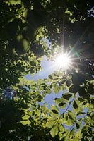 Als je omhoog kijkt, zie je van alles dat je niet verwacht. De zomerzon speelt door de bladeren, die als groene lampjes oplichten.