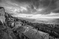 Het warme zonlicht raakt het stadje Montepulciano en het landschap van Toscane in Italië erachter.