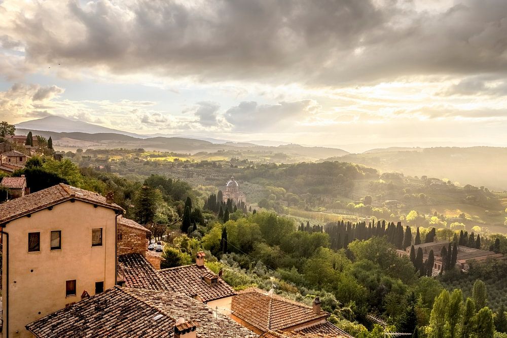 De stad Montepulciano en het achterliggende Toscaanse platteland baden in warm zonlicht.