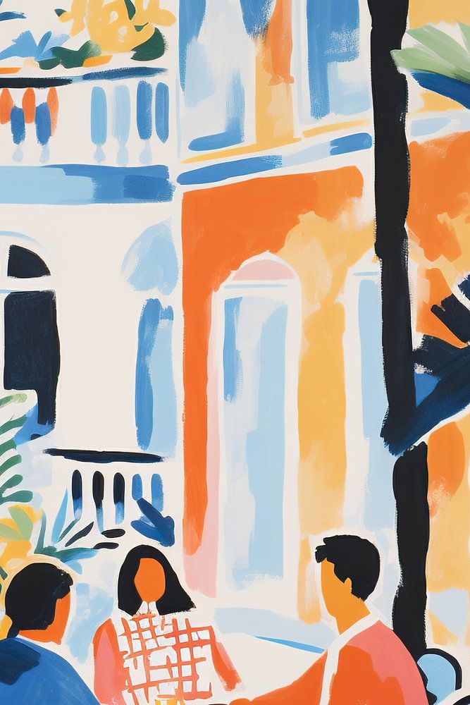 Zonnig Terras Kunst - Dit schilderij toont drie personen gezellig pratend aan een tafeltje, omringd door weelderig groen en onder dromerige blauwe hemel. De scène straalt een ontspannen, zonnige sfeer uit, geaccentueerd door levendige oranje en blauwe tinten, en gevangen in een vrije, expressieve penseelstreek die doet denken aan een modern, impressionistisch tableau.