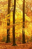 Zonnig bos tijdens een mooie mistige herfstdag met bruin gouden bladeren. De bosgrond van het Speulder- en Sprielderbos in natuurgebied de Veluwe is bedekt met bruine afgevallen bladeren en het pad verdwijnt in de verte. De mist geeft het bos een desolate sfeer.