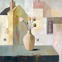 Breng rust en elegantie in je interieur met deze sfeervolle wanddecoratie. De harmonieuze combinatie van zachte pasteltinten en warme aardse kleuren creëert een serene en verfijnde uitstraling. De subtiele texturen en abstracte vormen nodigen uit tot dromen, terwijl het delicate bloemstuk en de architectonische elementen een charmant en tijdloos tafereel schetsen. Perfect voor wie houdt van een kunstzinnige, rustgevende ambiance in huis.