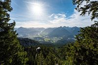 Zonnig uitzicht op Reutte in Tirol en de omliggende bergen