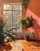 Dit vrolijke, trendy schilderij toont een rustieke en warm verlichte kamer, mogelijk een serre of zonovergoten hoek van een oud huis.