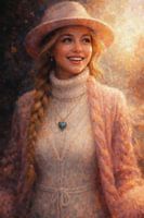 Hier loopt een glimlachende jonge vrouw met blond haar, gevlochten in een dikke vlecht over haar rechter schouder. Ze draagt winterkleding; een crème kleurige coltrui, met bijpassende jumpsuit. Daarover heen draagt ze een lange modieuze lichtroze cardigan met kabelpatroon en met pluizige, roze bontranden aan de mouwen en onderkant. Op…