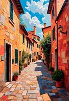 Laat je onderdompelen in de charmante ambiance van deze schilderij van een oude Italiaanse straat. De warme, levendige kleuren van de gevels – van goudgeel tot schitterend oranje – geven het kunstwerk een gevoel van vrede en vreugde. Deze unieke combinatie van zachte en gedurfde tinten roept gevoelens van nostalgia op en brengt de magie van Italië naar je interieur. De strategisch geplaatste planten in potten en de schaduw van de gebouwen creëren een uitnodigende sfeer van rust en sereniteit. Het werk benadrukt de speelse vormen en texturen van de architectuur, elk detail zorgvuldig aangebracht met een kwast, wat zorgt voor een dynamisch effect. Dit meesterwerk is niet alleen visueel aantrekkelijk, maar ook perfect voor liefhebbers van moderne kunst die hun woonkamer, kantoor of eethoek willen verfraaien. Met dit kunstwerk haal je niet alleen een stukje Italië naar binnen, maar ook een bron van inspiratie en een gevoel van thuis. Het is een schilderij dat iedere bezoeker zal aanspreken en een glimlach op hun gezicht zal toveren.