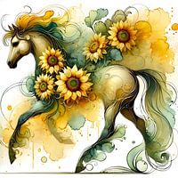 De vloeiende lijnen en sprankelende aquarel- en alcoholinkteffecten brengen het paard en de bloemen tot leven, terwijl de warme, natuurlijke tinten een gevoel van harmonie en energie uitstralen. Deze print is een prachtige toevoeging aan elke ruimte, van een serene slaapkamer tot een inspirerende woonkamer of kantoor.