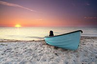 Een prachtige turquoise gekleurde vissersboot op een wit zandstrand in de Caraïben.