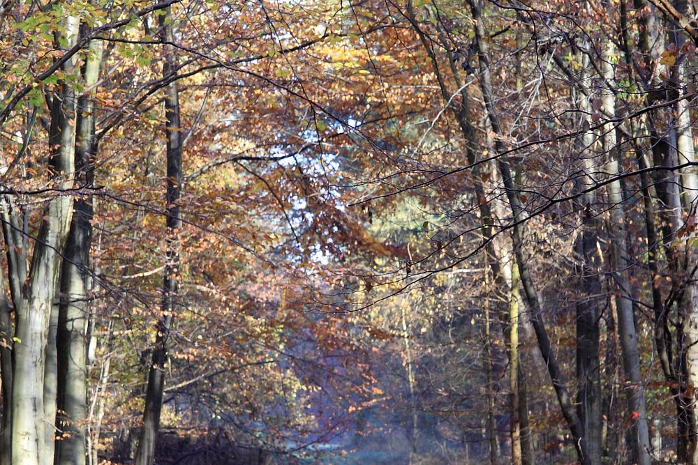 Een zonnige bospad in de herfstkleuren. Nog net voordat alle bladeren van de bomen af zijn en een zachte bladerentapijt op de grond ligt. En de zon door de kale boomtakken heen schijnt en een frisse lucht kunt ademen.