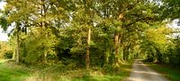 Een foto van eikenbomen aan de rand van een bos. Foto is genomen op een zonnige herfstdag. Rechts loopt een pad het beeld in.