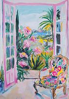 Dit expressieve olieverfschilderij verbeeldt een zonnige zomerdag aan de Franse Rivièra. Helder licht stroomt de kamer binnen door grote, openstaande Franse ramen en valt op een knusse fauteuil met een roze bloemenpatroon. Buiten bloeien roze bloemen voor een rustige tuin die oplicht in zachte kleuren zoals roze, lichtblauw, geel, wit en groen.