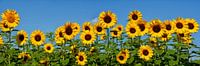 Zonnebloemen in overvloed. Mooi verenigd op een rij om een panorama te vormen. Een zonnige dag met een blauwe hemel en een zee van zonnebloemen. Zomer voor de muur.
