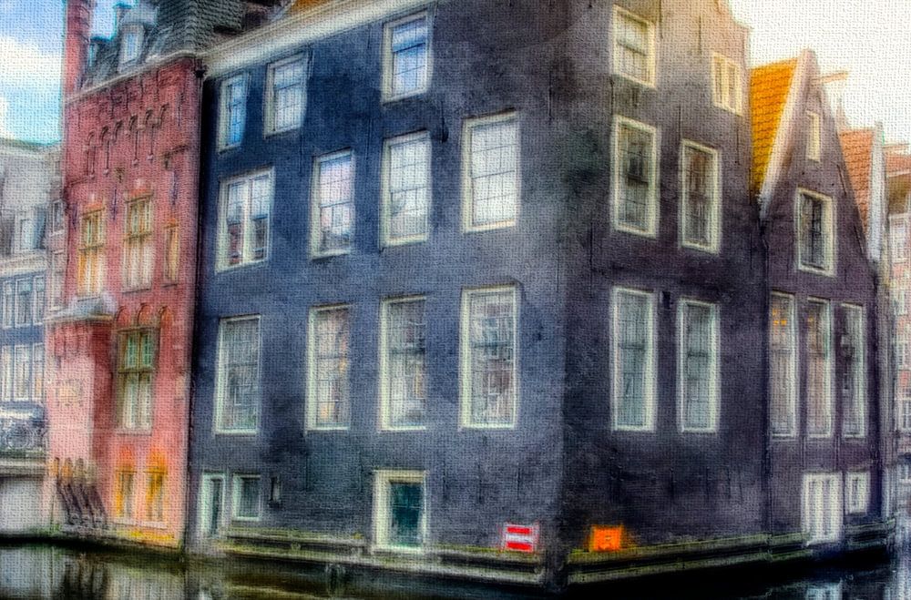 Een expressionistisch schilderij van een zonnige gracht in Amsterdam. Dit zeer gedetailleerde kunstwerk is een kunstige fusie van analoge en digitale illustraties in de stijl van de klassieke kunst.
