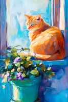 Een zacht licht omlijst de oranjekleurige kater, die in een ontspannen houding op de vensterbank blijft zitten. De harmonieuze combinatie van levendige kleuren en de delicate bloemenpracht geeft de kamer een kalme elegantie. Perfect voor de woonkamer om een uitnodigende en gezellige sfeer te creëren.