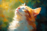 Een gouden vacht gloeit zacht in het licht, terwijl de gelaatstrekken van een tevreden gezicht pure gelukzaligheid uitstralen. Gesloten ogen en een lichte glimlach duiden op een vredig moment, gevangen in de warme omhelzing van de natuur. Omgeven door zachte kleuren dansen licht en schaduw terwijl de wereld even lijkt stil te staan.