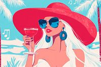 Een stralend zomergevoel straalt uit deze levendige scène, waarin een stijlvolle dame met een opvallende rode hoed, een grote zonnebril en een verfrissende cocktail staat voor ontspanning aan het strand. Tropische palmbomen en zachte melodieën omringen haar, wat perfect is voor een woonkamer of barhoek - een veelbelovend vleugje vakantie!