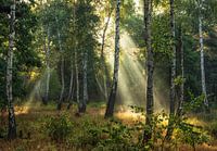 Zonnige ochtend in het bos. De zonnestralen dringen door de takken van de bomen. Mooi weer.