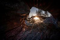 Zon tussen de takken van een oude omgevallen boom op de Kampina in Boxtel, Noord-Brabant, Nederland