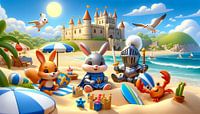 Hier zien we kleine dierenridders genieten van een zorgeloze dag op het strand. Een vos en twee konijnen, waarvan één in vol ornaat, bouwen zandkastelen voor een imposant kasteel. De afbeelding is rijk aan details: een kristalheldere zee, zeilboten in de verte, palmbomen en een levendige strandboulevard. De zonnige sfeer wordt benadrukt door de stralende zon en de helderblauwe lucht. De personages zijn zichtbaar ontspannen en vrolijk, waardoor de afbeelding een perfecte weergave is van vrije tijd en spel in een middeleeuwse stijl.