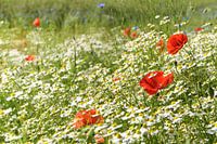 Zonnige zomerweide met bloeiende klaprozen, veel kamille of witte madeliefjes en korenbloemen, mooie wilde bloemen achtergrond met kopieerruimte, geselecteerde focus, smalle scherptediepte