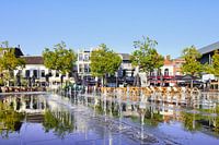 Zonovergoten Heuvel plein met waterstralen op een glanzende plein met restaurants en cafés op de achtergrond, Tilburg