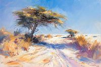 In deze levendige schildering wordt een woestijnlandschap tot leven gebracht onder een stralend blauwe hemel. De eenzame boom biedt schaduw tegen de felle zon, terwijl de zachte penseelstreken de warmte van het zand en de koelere tinten van de schaduw vastleggen. De dynamische kleuren en het spel van licht en schaduw geven deze schildering een energie en frisheid die een uitnodigende sfeer creëren. Dit kunstwerk is ideaal voor een modern interieur dat een vleugje natuurlijke schoonheid en rust wil toevoegen.