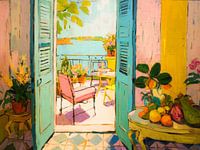 Dit schilderij vangt de charme van een zonnige ochtend op een kleurrijke patio. De open deuren leiden naar een betoverend uitzicht op het buitenleven, waar felle kleuren en weelderige planten samenkomen in een levendig tafereel. De penseelstreken geven het werk een speelse, energieke sfeer, die het gevoel van warmte en ontspanning…