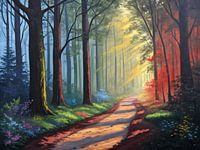 Dit levendige schilderij vangt de betoverende schoonheid van een bos dat baadt in het zonlicht. Een kronkelend pad, weergegeven in warme perzikkleuren en lavendelkleurige schaduwen, nodigt de kijker uit om dieper het bos in te dwalen. Torenhoge bomen, met hun stammen verlicht door gouden licht, creëren een gevoel van diepte en grootsheid. Het gebladerte aan weerszijden van het pad explodeert in een symfonie van kleuren, van het koele blauw en paars aan de linkerkant tot het vurige rood en geel aan de rechterkant. Strepen zonlicht priemen door het bladerdak en werpen lichtgevende stralen die over de bosgrond dansen en een magische sfeer creëren. De algehele indruk is er een van rust, die uitnodigt tot contemplatie en een verbinding met de serene schoonheid van de natuur.