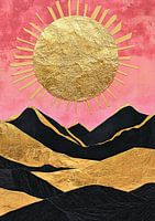 Een abstracte voorstelling van bergen en het hemellichaam van de zon of maan, beïnvloed door de eenvoudige elegantie van de Japanse schilderkunst. Het schilderij straalt een kalmerende maar krachtige sfeer uit.