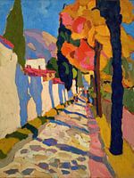 Dit levendige schilderij in fauvistische stijl toont een smal geplaveid pad dat baadt in het zonlicht, geflankeerd door een hoge witte muur en levendige herfstbomen. Gedurfde, ongemengde kleuren en sterke contrasten creëren een speelse, energieke sfeer die de frisse schoonheid van de herfst met expressieve warmte vastlegt.