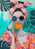 Een illustratie van een vrouw die thee drinkt in de zon, in de stijl van door Mexicaanse folklore geïnspireerde, acryl kunst. Vrolijk, met roze en aquamarijn tinten, polychrome terracotta, met gedurfde contrasten en speels textuurspel, creëert een levendig beeld. Het geheel straalt een speelse, maar toch verfijnde sfeer uit.