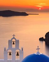 Panagia van Agioi Theodoroi (Saints Theodore) kerk op de rand van de caldera in Firostefani dorp, ook bekend als de kerk met de drie klokken. Santorini één van de eilanden van Cycladen in Egeïsche Zee, Griekenland.