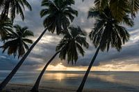 Zonsondergang op het strand van Aitutaki, Cookeilanden. De palmbomen maken het en waar paradijs.