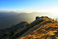 Sfeervolle zonsondergang op de top van de Stuiben in de herfst. Allgäuer Alpen, Beieren, Duitsland, Europa