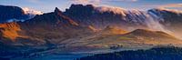 Panoramafoto van een zonsondergang op Alpe di Siusi (Duits; Seiser Alm), een Dolomietenplateau en de grootste alpenweide op grote hoogte van Europa. Gelegen in de Italiaanse provincie Zuid-Tirol in het Dolomietengebergte.