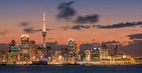 Een avond tijdens zonsondergang met het uitzicht op de verlichte skyline van Auckland, nieuw-Zeeland, met de Sky Tower, de hoogste vrijstaande structuur op het zuidelijk halfrond.