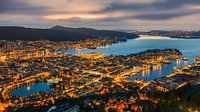 Een zonsondergang vanaf de berg Floyen over Bergen (historisch Bjørgvin). Een grote stad en gemeente in Hordaland aan de westkust van Noorwegen.