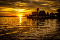 Sfeervolle zonsondergang aan het Bodenmeer in Langenargen met kasteel Montfort in Duitsland