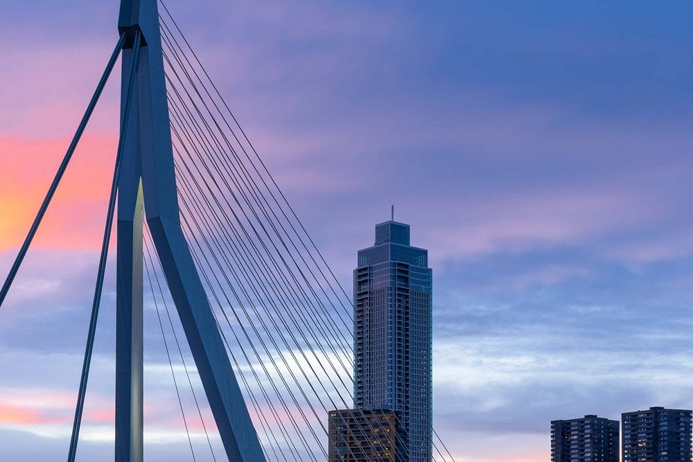 Die kleuren die achter de Erasmusbrug opkomen bij zonsondergang, schitterend toch?