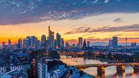 Een 16x9 foto van een zonsondergang boven Frankfurts Mainhattan, het centrale zakelijke district van Frankfurt am Main in Duitsland.