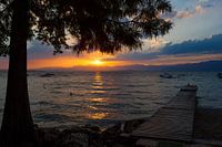 Zonsondergang Garda Meer. Een mooie warm kleurige zon die langzaam achter de bergen aan het Garda Meer verdwijnt. De overdag druk bezochte steiger ligt er nu rustig en verlaten bij.
